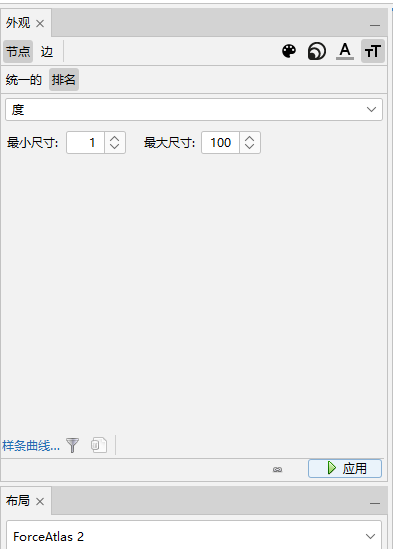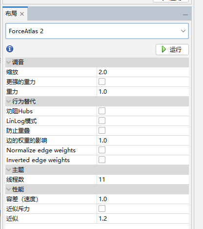点击【布局】,选择ForceAtlas 2,并且勾选行为替代中的劝阻Hub、LinLog模式、防止重叠,点击运行