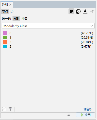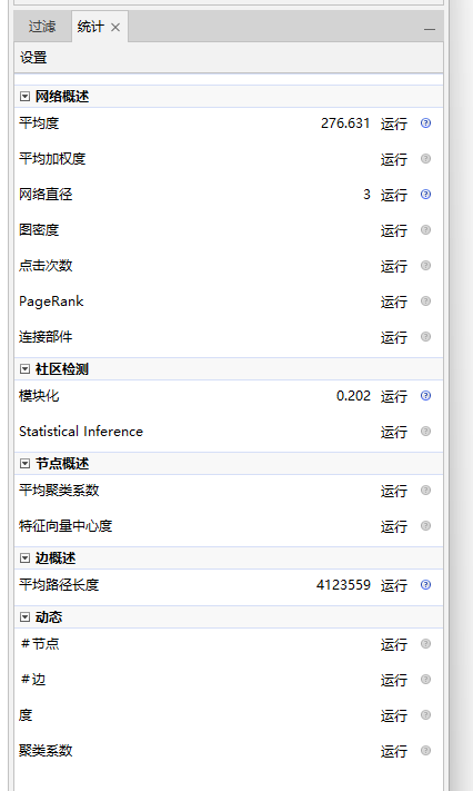 在[概览]-[统计]中,运行【度】、【模块化】、【网络直径】